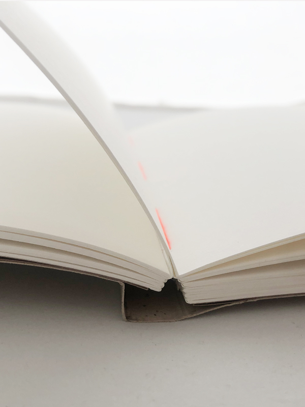 Środek uszyty z niepowlekanego papieru premium w kolorze cieplej bieli, zaskakuje żarzącą się pomarańczowo–różową nicią.