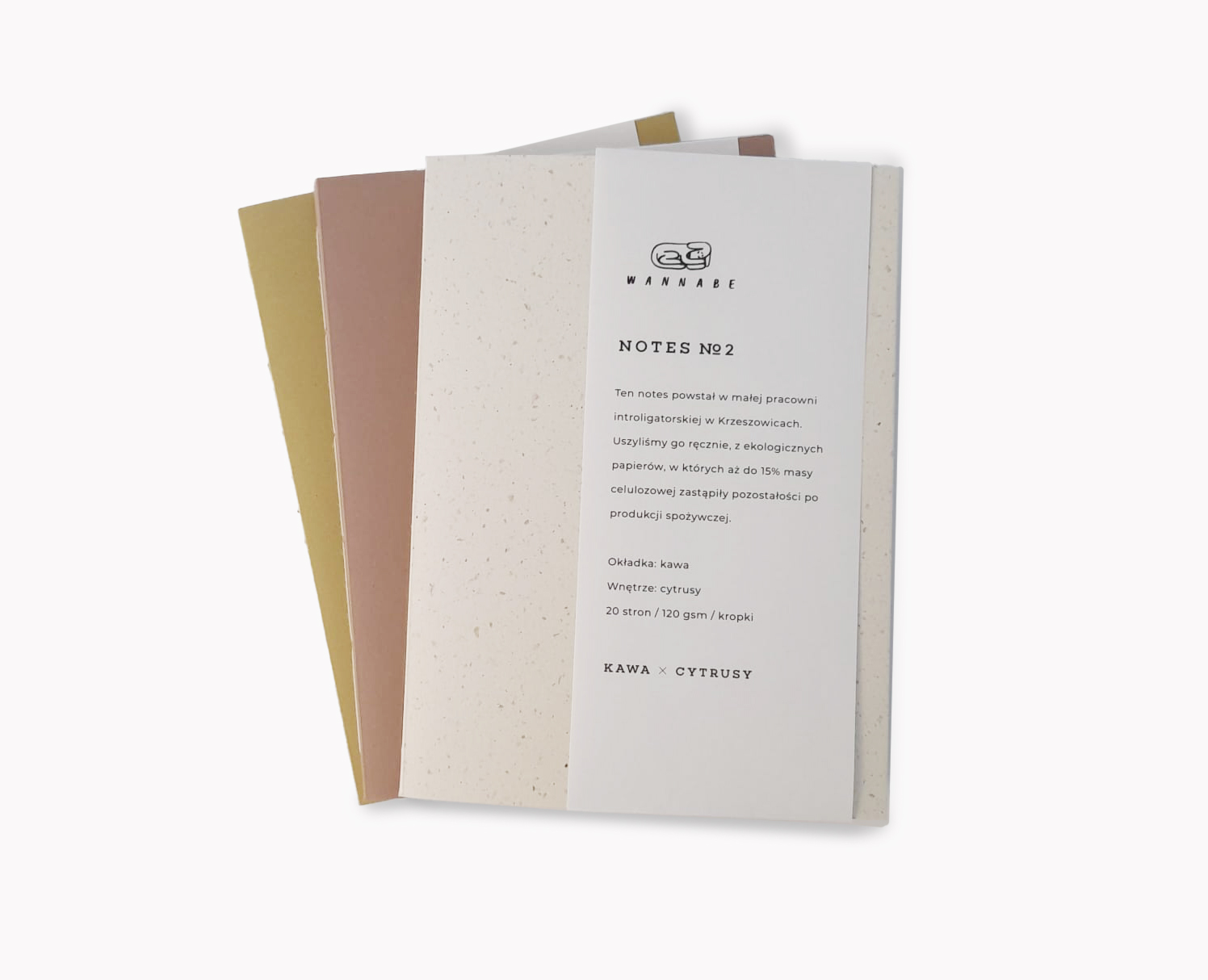 Wykonany z ekologicznych papierów, w których część masy papierniczej zastąpiły pozostałości po produkcji spożywczej. W okładce są to oliwki, środek zeszytu wzbogaciła kukurydza.